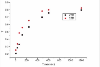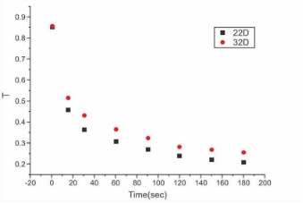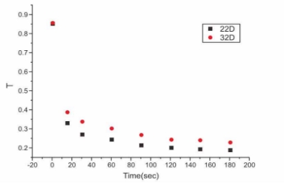 Relationship between light transmittance (T) and illumination time /sec.(no illumination)
